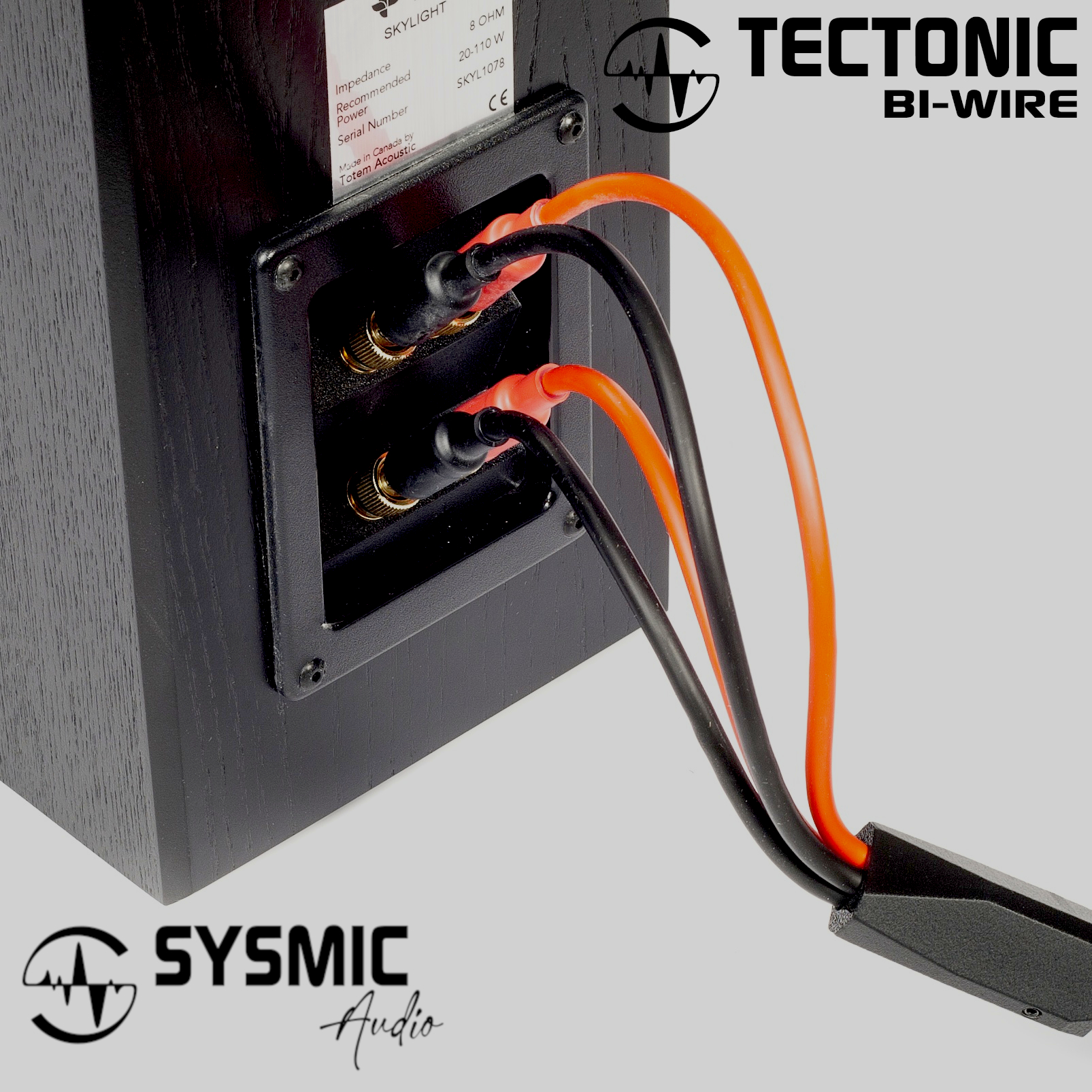 Avec la série Tectonic, vous obtiendrez un son très détaillé ainsi que plus d’impact dans les basses fréquences. Un câble de quatre conducteurs de calibre 13 AWG est utilisé. Différentes possibilités de terminaisons vous sont offertes: simple, double ou bi-câblée. Chaque conducteur est constitué d’une combinaison de cuivre OCC et d’argent. Avec notre configuration à multiconducteurs, chaque polarité équivaut à un calibre 10 AWG. Finalement, les matériaux retenus procurent une excellente flexibilité au produit final.